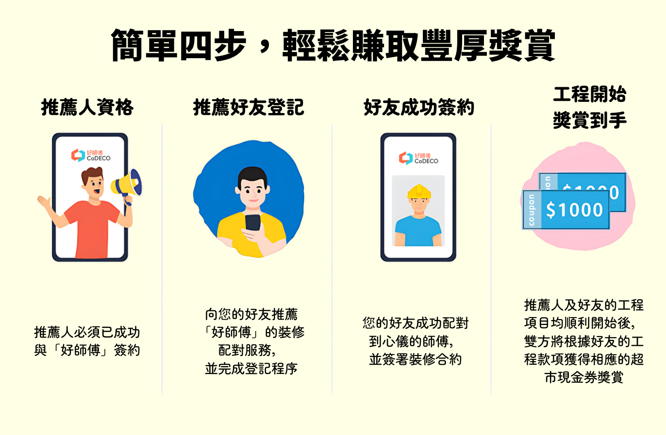 2. 推薦好友登記: 向您的好友推薦「好師傅」的裝修配對服務,並完成登記程序