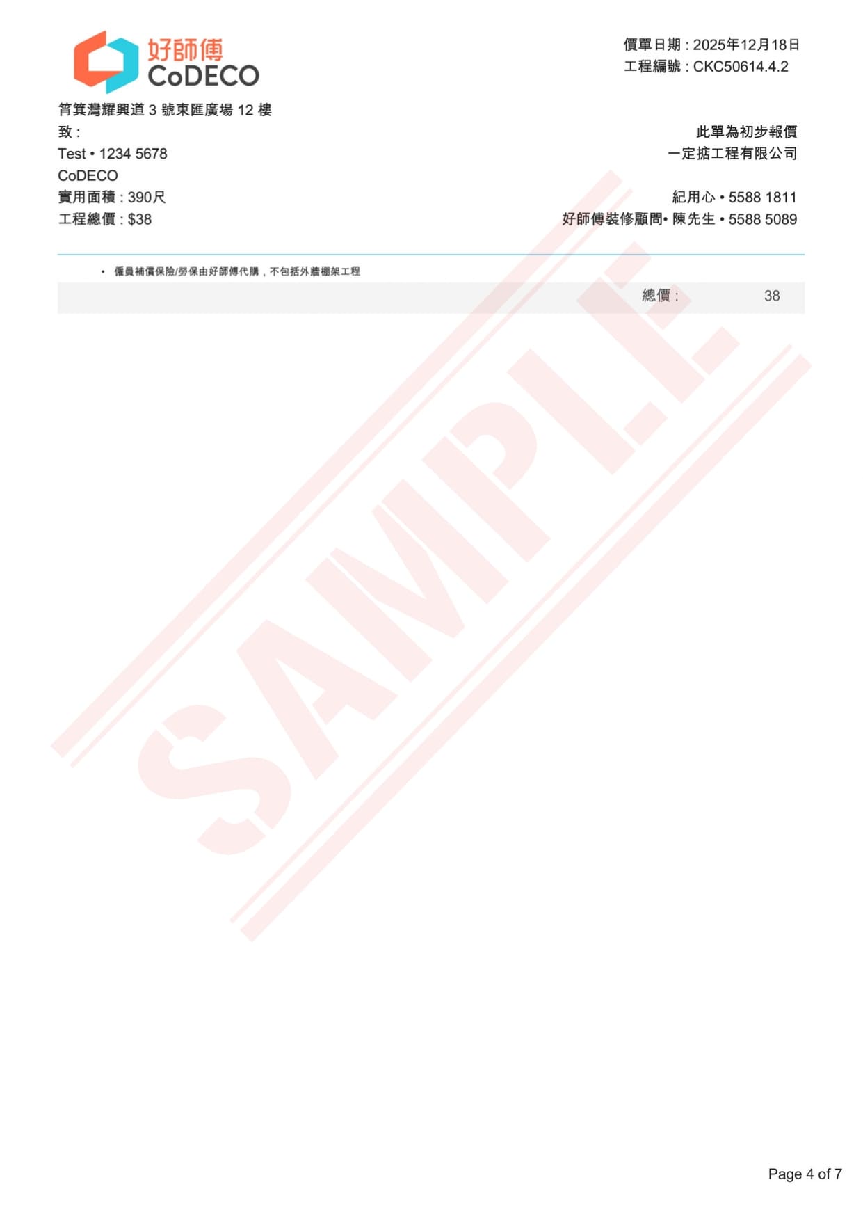 以原合約所列的項目計算,不包括後加工程項目,受條款及細則約束。